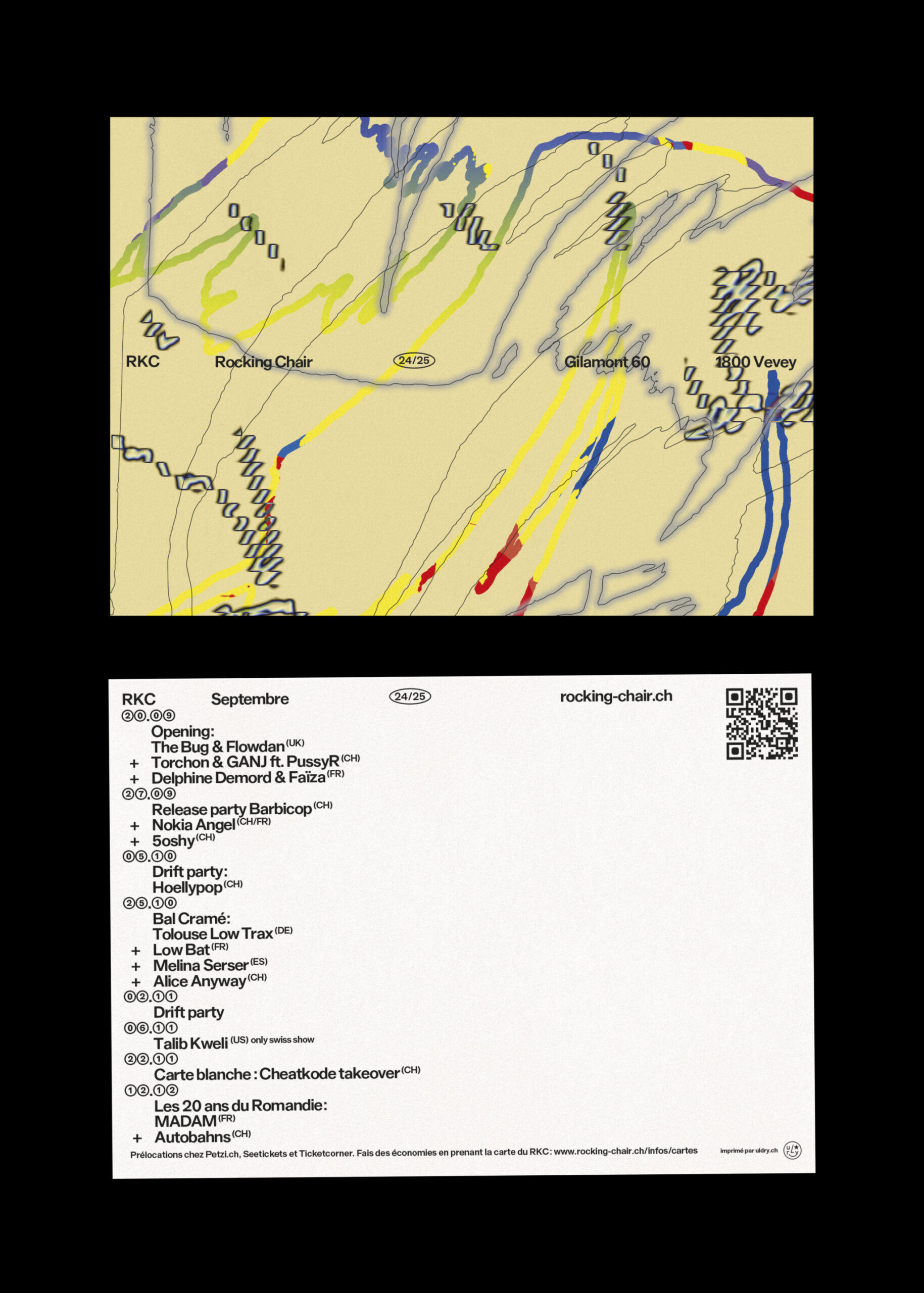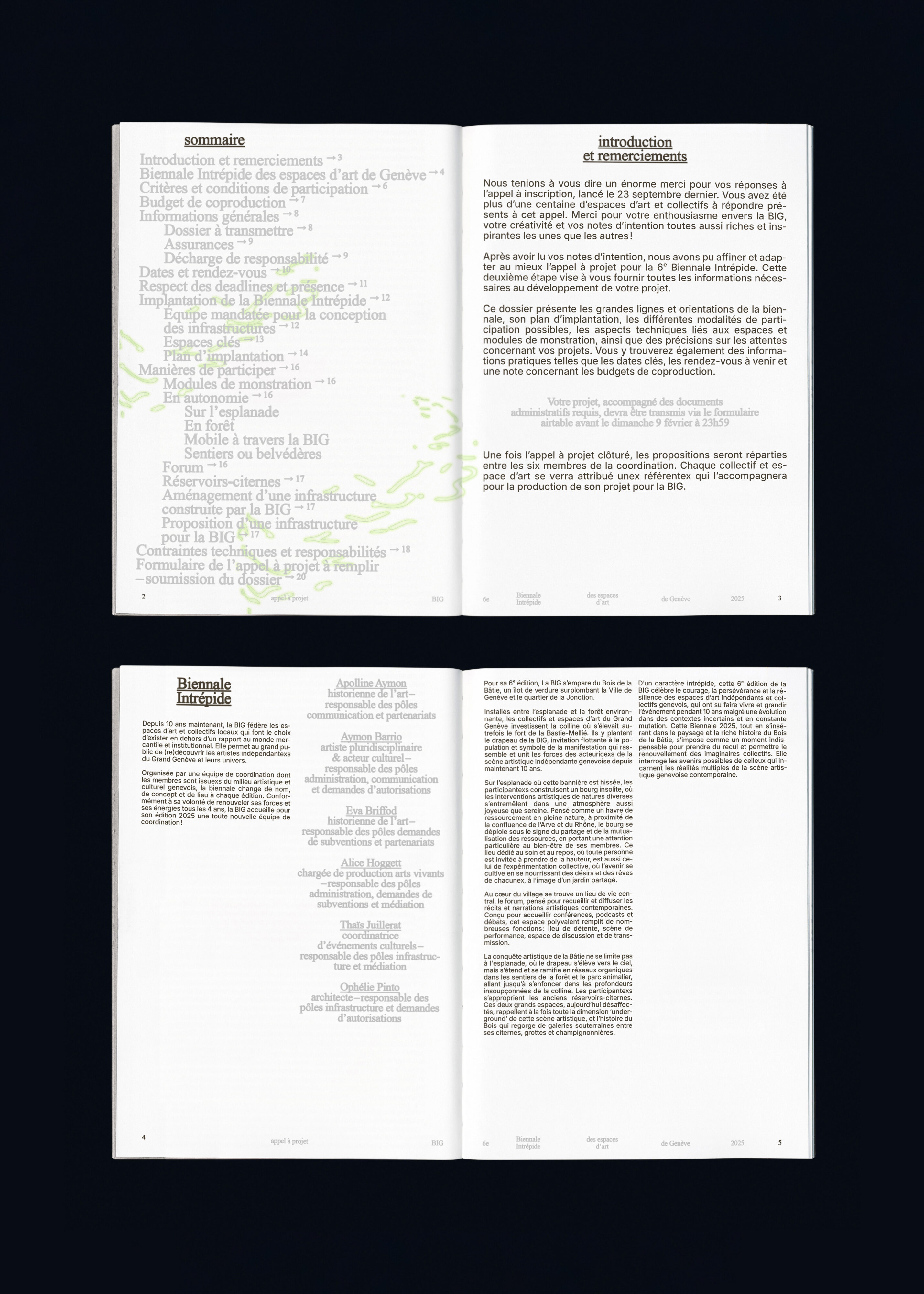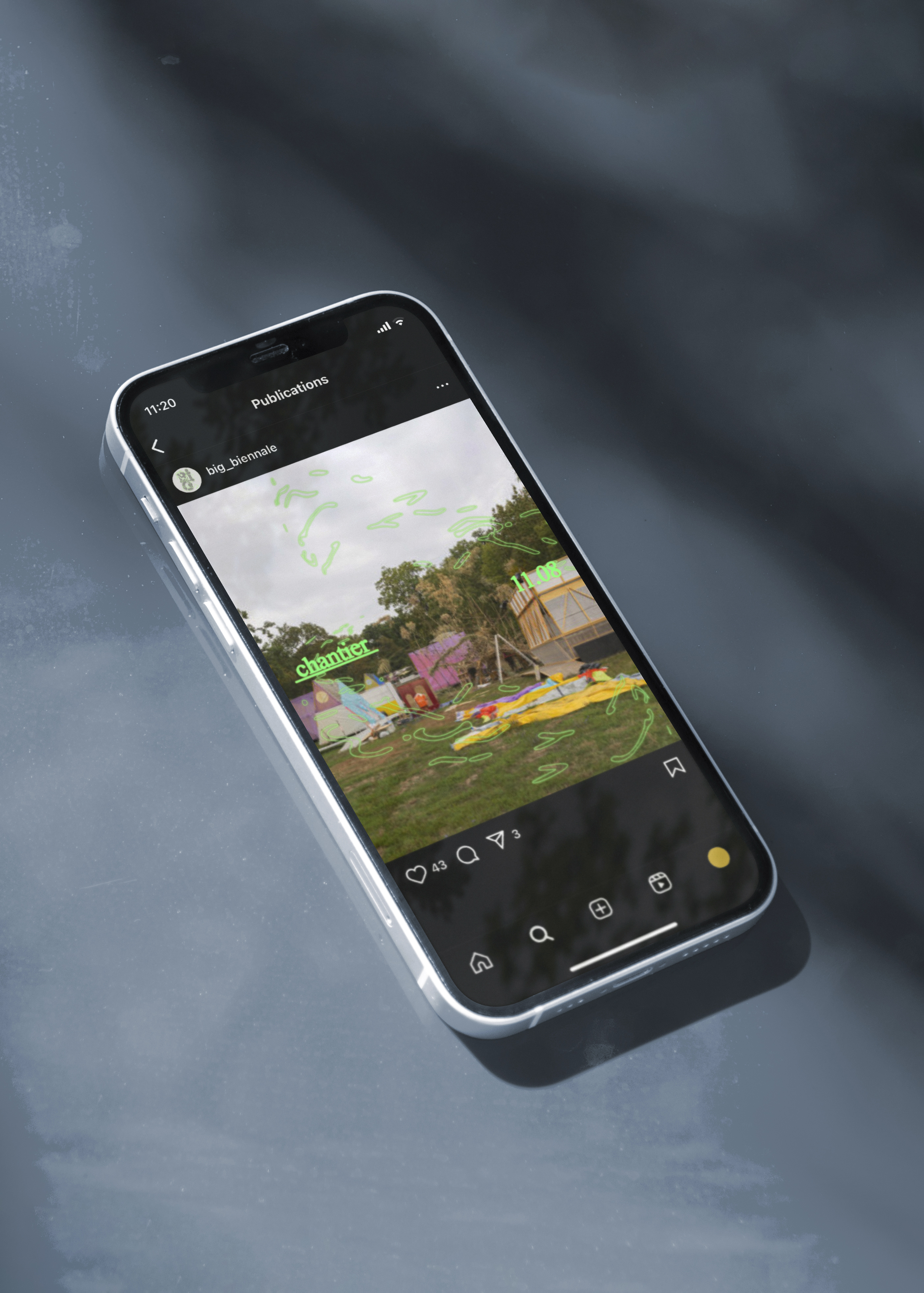 The identity draws direct inspiration from the forest—the very site where the biennale unfolds this year—seen as a self-sustaining whole where each organism contributes to an interdependent system, a model we turn to when imagining new ways of doing together and collaborative practices. Taking its roots from the writings of authors such as Richard Powers and Uriel Orlow, the visual was conceived as an interconnected structure, a world with shapes inspired by the plant realm (spores, vines, roots, etc.), appearing at multiple scales: from microscopic elements to the immense, BIG!